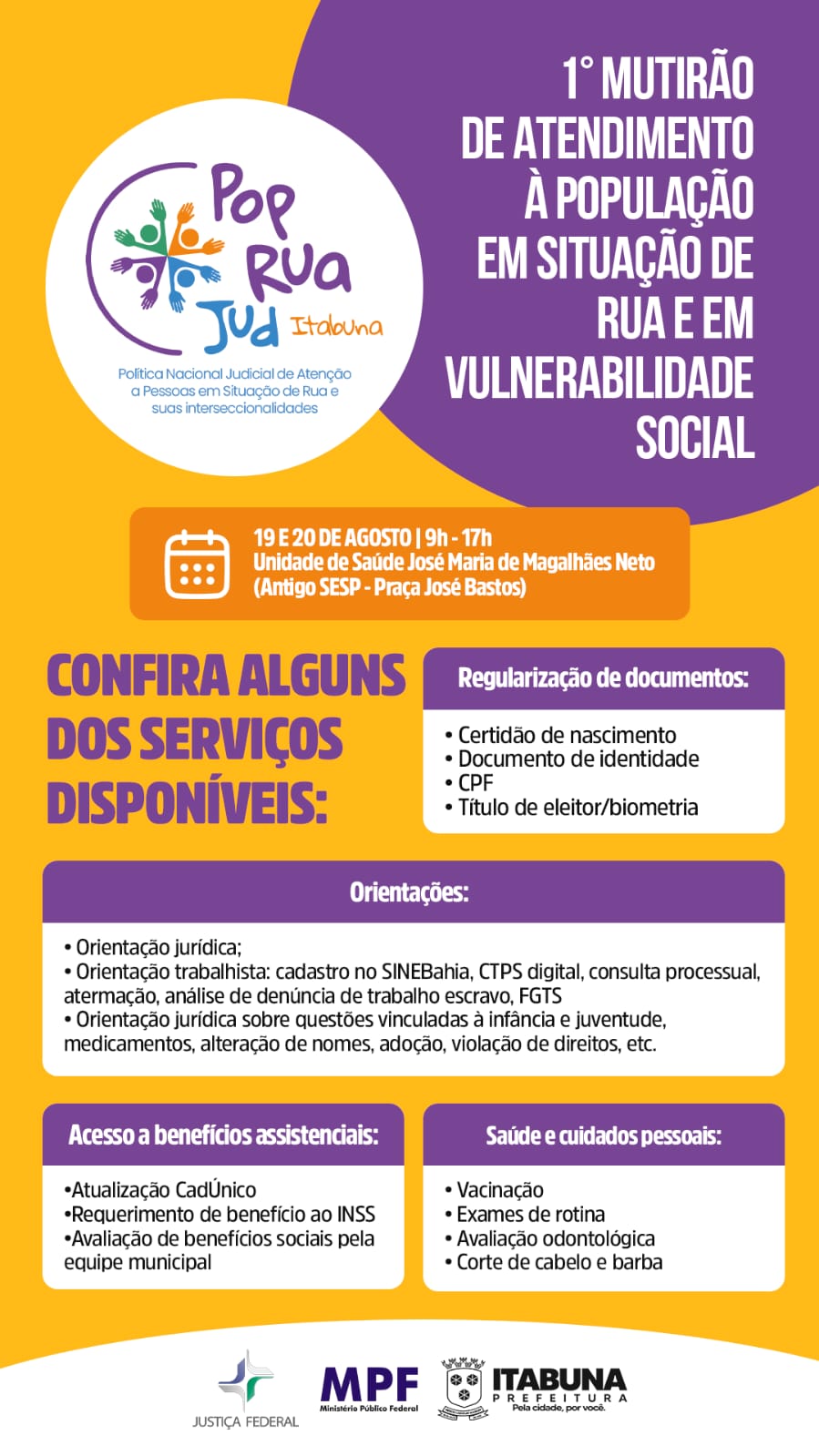 Pessoas em situação de rua e em situação de vulnerabilidade social terão, nesta terça-feira (19) e quarta-feira (20), das 9 às 17 horas, na Unidade Básica de Saúde José Maria de Magalhães Neto (antigo SESP), no centro de Itabuna, a oportunidade de acessar diversos serviços importantes em um só local e de forma facilitada, durante o 1º Mutirão POP Rua Jud.
